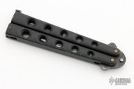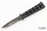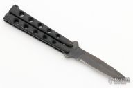 This Dragon Claw by Taylor/Seto Balisong with black handles. Has a black finished blade with a false top edge. Has some scratches and scuffs, otherwise good condition.