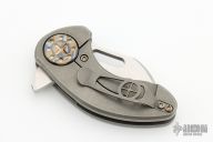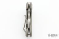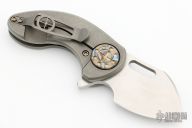 This Nano framelock flipper by Curtiss Knives features a stonewashed blade with notched thumbrest and flipper, and a thumbhole. The handle has a tumbled titanium frame witha matching tip up clip. Stainless steel lock insert. Nice detent, lockup and blade seating. Rides on caged bearings.  Comes with a zippered case.  Excellent condition.