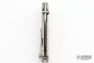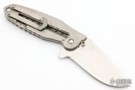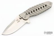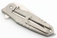 This Frame Lock Flipper has a satin finished spear point blade with a sharpened top edge. The handle has milled titanium handles with a matching tip up clip. Lanyard hole. Nice detent, lockup and blade seating. Excellent condition.