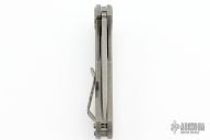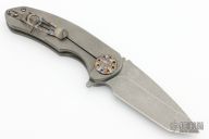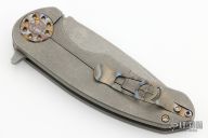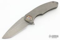 This F3 Retro by Curtiss Knives features a dark stonewashed blade with notched thumbrest and flipper. The handle has a tumbled titanium frame over standoffs with a anodized titanium tip up clip. Smooth and fast opening using a Caged Bearing System. Nice blade seating, detent and lock up. Includes padded and zippered case. Nice detent, lock up and blade seating.  Excellent Condition.