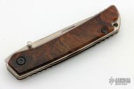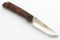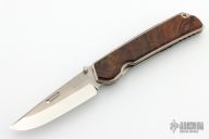 This Higo from Rockstead features a two toned drop point blade with mirror polished grinds, dual thumb studs and notched thumbrest. The handle is comprised of ironwood scales over steel liners and a single barrel spacer. Lanyard hole in pommel. Includes original box, COA and black leather belt sheath. Excellent Condition.
