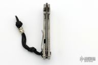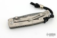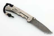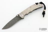 This framelock folder by Spartan Blades features a Damascus drop point blade with dual thumbstuds and a notched thumbrest. The handle has a tumbled titanium frame with a tip up titanium clip and filler tab. Has nice detent, lockup, and blade seating. Comes with original box. Excellent condition.