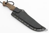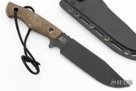 The Rold from VoxKnives is an awesome camp size knife from Boker Plus. The blade is black finished D2 tool steel with a flat grind and a plain edge. The massive full tang construction is complemented by smooth contoured G-10 scales that are red fiber lined with rivet tubes, one of which doubles as an over-sized lanyard hole. The handle scales are flared at the butt for heavy duty handling while the index choil, combined with the spine jimping allows comfortable and controlled choking up on the blade for more delicate tasks. Included is a Tek-Lok compatible Kydex sheath.