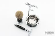 This classic shaving kit has been produced, entirely by hand, for generations. The traditional razor with an exchangeable blade is said to be the first mechanical shaver. A marvel of precision and ergonomics that has been created for the ambitious user. The brush of pure badger hair and the shaver of black synthetic resin with chromed nickel-plated parts are both made by hand. Comes complete with metal stand, and is packaged in an elaborately chromed metal box. Comes with original box. Excellent unused condition.