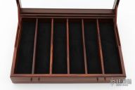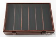 This model has two-levels, a glass top, and a total of 6 slots. All Tomway chests and boxes are made of exotic cocobolo rosewood. As unique as nature itself, cocobolo rosewood ranges from a rich dark brick red to reddish or dark brown, with a figuring of darker irregular traces weaving through the wood. This is a wood so dense (70 lbs. per sq. foot) and rich that it provides not only a quality setting for your collectibles, it also offers substantial protection. All chests and boxes are padded and upholstered with a premium acid free micro-suede. Excellent condition.