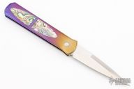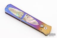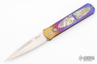 This Godfather from Pro-Tech Knives features a satin finished spear point blade with swedge. The handle has an orange peeled finished anodized Titanium frame with abalone inlays on the handle and push button over barrel spacers. Includes original box. Excellent Condition.