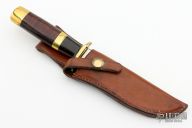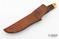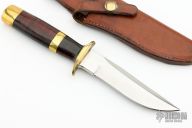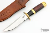 This Fighter by John Nelson Cooper features a satin polished blade with a false top edge, .197" blade stock and 1.079" blade depth, hidden tang construction. The handle has brass guard and butt cap with a dymondwood grip. Comes with original brown leather sheath. Has some light scratches, otherwise excellent condition.