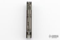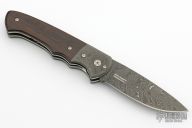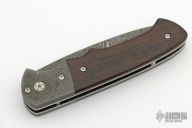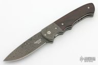 This Damast Jahresmesser 2015 has a Nichols Boomerang Damascus drop point blade. Handle has matching bolsters, and dark Grenadill wood scales over stainless steel linersand titanium posts. Comes with original papers and presentation box. Excellent Condition.