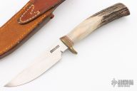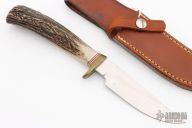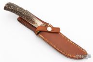 This Model 7-4.5 by Randall Made Knives features a satin finished blade with .157" blade stock and 1" blade depth, hidden tang construction. The handle has a brass guard, stag grip and red/white/blue spacers. Knife comes with a brown leather sheath. Has a couple small oxidation spots, otherwise excellent condition.