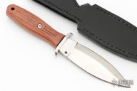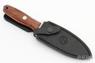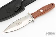 This Applegate-Fairbairn Mini Smatchet by Boker Knives has a satin polish finished double edged spear point blade with .184" blade stock, 1.439" depth. The handle is comprised of a matching steel guard with black fiber spacer with wood handle over hidden tang construction. Lanyard hole in pommel. Includes original box, papers, and leather sheath with belt loop. Numbered 105/199 on guard. Excellent condition.