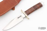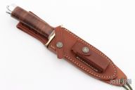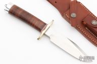 The Model 15 was designed especially for air crew survival and combat purposes in cooperation with U.S. Marine Corps Equipment Board. This knife has a 5.5" blade with sharpened top edge, .214" blade stock and 1.247" blade depth, cut down tang (hidden tang).  The handle has a nickel silver guard and duralumin butt, stacked leather grip, red/white/blue spacers, lanyard hole, tang nut. Comes with a brown leather sheath. Excellent condition.