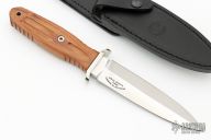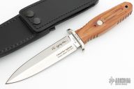 This Applegate-Fairbairn Combat Dagger by Boker Knives has a satin polish finished double edged spear point blade with .184" blade stock, 1.285" depth. The handle is comprised of a matching steel guard with black fiber spacer with Rosewood handle over hidden tang construction. Lanyard hole in pommel. Includes original box, papers, and leather sheath with belt loop. Numbered 084/199 on guard. Excellent condition.