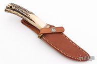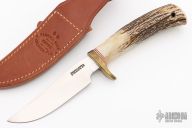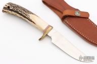 This Denmark Special from Randall Made Knives features a satin finish clip point blade with .179" blade stock and 1.104" blade depth, hidden tang construction. The handle is comprised of a brass guard, stag grip with red/white/blue spacers. Comes with brown leather sheath. Excellent condition.
