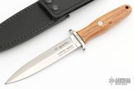 This Applegate-Fairbairn Boot Dagger by Boker Knives has a satin polish finished double edged spear point blade with .182" blade stock, 1.085" depth. The handle is comprised of a matching steel guard with black fiber spacer with Rosewood handle over hidden tang construction. Lanyard hole in pommel. Includes original box, papers, and leather sheath with belt loop. Numbered 104/199 on guard. Excellent condition.