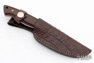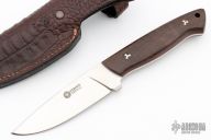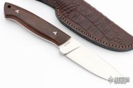 This Arbolito by Boker knives features a satin finished drop point blade (N695) with notched thumbrest, .205" blade stock, 1.165" blade depth and full tapered tang construction. The handle features Guayacan Ebony scales with red liners, and mosaic pins. Lanyard hole in the base. Comes with leather sheath with belt loop and original box. Excellent condition.
