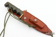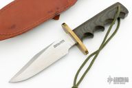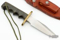 This Model 15 Airman by Randall Made Knives features a clip point blade with a sharpened top edge, .204" blade stock. 1.244" blade depth, full tang construction. The handle has black linen micarta handle with finger grips and a brass guard. The Model 15 is designed especially for heavy-duty use and to be as nearly indestructible as possible. Comes with a brown leather sheath. Has a small oxidation spot on the blade, otherwise excellent condition.
