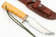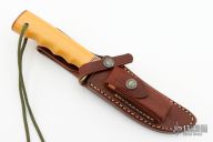 This Model 3-5 by Randall Made Knives has a satin finished blade with false top edge and a notched thumbrest, .194" blade stock and 1.183" blade depth, hidden tang construction. The handle has a brass guard and butt, finger groove yellow linen Westinghouse micarta grip and red/white/blue spacers. Comes with a brown leather sheath and original paper wrapping. Has a couple small oxidation spots, otherwise excellent condition.