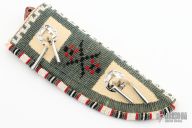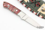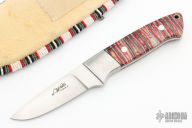 This Hunter by Rod Watts features a hand rubbed satin finish blade with .154" blade stock, 1.020" blade depth, full tang construction. The handle has satin finish stainless steel bolsters and mammoth tooth scales, black liners, spine of tang is fileworked. Excellent work. Beautiful materials. Comes with nylon zippered case. Comes with a beaded leather sheath. Excellent condition.