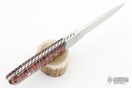 "I made my first knife in 2008 under the direction of my friend and mentor Rusty Preston. We are blessed to have a vacation home across the street from Rusty in Port Isabel, Texas. As most of you know Rusty is a well known slip joint maker and so my early knives were also slip joint folders. In 2009 I started making fixed blades and the majority of my knives since have been fixed blades. The file work I learned to do on the early folders has been very helpful in making the fixed blade knives appealing to collectors and has proven to be a real niche. I have come a long way in a few years with help from guys like Rusty and Steve Johnson. I was very fortunate to spend some time in Steve's shop early 2011, what an amazing opportunity. With the help and knowledge gleaned from these guys I was able to win the best new maker award at the 2011 Blade show in Atlanta with a mammoth tooth fighter. Most of my fixed blades now feature mammoth tooth or fossil coral. I also do a lot of mammoth ivory and stag."
