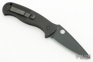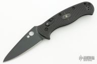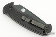 This Citadel auto by Spyderco features a black coated blade with swedge and thumb hole. Has notched thumbrest. Frame is milled and textured black aluminum with push button and safety. Clip is tip up carry, and reversible for right or left handed carry. Has some light scuffs, otherwise excellent condition.
