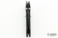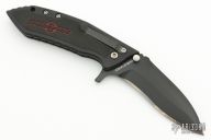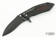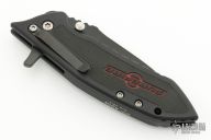 This knife features a black DLC coated zero ground blade with false top edge, notched thumbrest, and dual thumbstuds and flipper. The handle has a black aluminum frame with black G-10 inserts, 2 black titanium clips, one on the right side and one on the left. #0315 on handle spine. Excellent Condition.