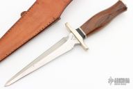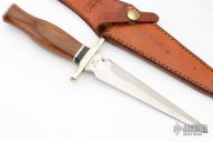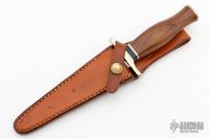 This Arkansas Toothpick by Ralph Bone and Charles Hipp features a satin finished double edged blade, .232" blade stock and 1.097" blade depth, hidden tang construction. The handle has a nickel silver guard and butt cap, and a cocobolo grip with nickel silver and black spacers. Comes with a brown leather sheath. Blade is marked "AT 81.8". Has some light patina, otherwise excellent condition.