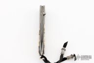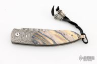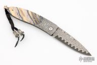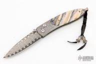 This B05 DMD Catalina button lock folder by William Henry Knives features a ZDP-189 "wave" Damascus blade with a single thumbstud with a white topaz inlay. The handle has a carbon ladder Damascus frame with Fossil Mammoth Tooth scales with black liners, push button with white topaz inlay, lanyard bail with sterling silver bail and beads. Includes box and papers, not oriignal. The COA included with this knife is for a different model. Excellent condition.