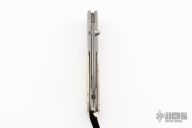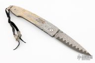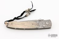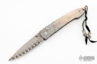 This B10 DMD Catalina button lock folder by William Henry Knives features a ZDP-189 "wave" Damascus blade with a single thumbstud with a white topaz inlay. The handle has a carbon ladder Damascus frame with Fossil Mammoth Tooth scales with black liners, push button with white topaz inlay, lanyard bail with sterling silver bail and beads. Includes box and papers, not oriignal. The COA included with this knife is for a different model. Excellent condition.