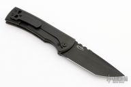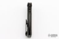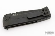 This Chaves Ultramar Redencion drop point features a black tanto blade. The handle is made up of Dark Matter Gold carbon fiber and black titanium frame, skull pocket clip (positioned for tip up carry), and a matching titanium backspacer. Comes with original box and an extra regular titanium pocket clip. The knife opens with the use of Lee Williams' Kick Stop flipper. Includes the original box. Excellent condition.