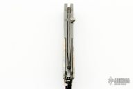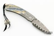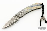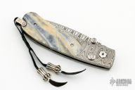 This B05 DMD Catalina button lock folder by William Henry Knives features a ZDP-189 "wave" Damascus blade with a single thumbstud with a white topaz inlay. The handle has a carbon ladder Damascus frame with Fossil Mammoth Tooth scales with black liners, push button with white topaz inlay, lanyard bail with sterling silver bail and beads. Includes original box, sheath and certificate of authenticity dated December 13, 2006. Excellent condition.