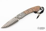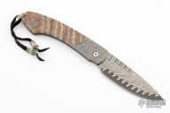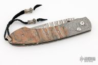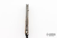 This B12 DMD Catalina button lock folder by William Henry Knives features a ZDP-189 "wave" Damascus blade with a single thumbstud with a white topaz inlay. The handle has a carbon ladder Damascus frame with Fossil Mammoth Tooth scales with black liners, push button with white topaz inlay, lanyard bail with sterling silver bail and beads. Includes original box, sheath and certificate of authenticity dated December 14, 2006. Excellent condition.