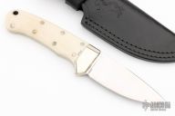 This knife by American Heritage VFO features a mirror polished blade with an etching of a Native American and a notched thumbrest, .154" blade stock and 1.340" blade depth, full tang construction. The handle has a nickel silver bolsters, white linen micarta scales with scrimshaw by "JC" and #0015. Comes with a black leather sheath. Excellent condition.