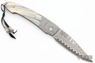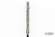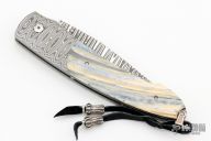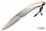This B12 DMD Catalina button lock folder by William Henry Knives features a ZDP-189 "wave" Damascus blade with a single thumbstud with a white topaz inlay. The handle has a carbon ladder Damascus frame with Fossil Mammoth Tooth scales with black liners, push button with white topaz inlay, lanyard bail with sterling silver bail and beads. Includes original box, sheath and certificate of authenticity dated December 15, 2006. Excellent condition.