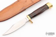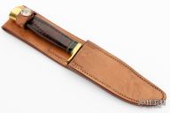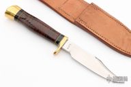 This Model L Bowie by GW Stone features a satin finished clip point blade with a nearly sharpened top edge, .186" blade stock and .955" blade depth, hidden tang construction. The handle has a brass guard and butt cap, stacked leather grip with black spacers. Has some very light oxidation spots on the blade, otherwise excellent condition. Comes with a brown leather sheath.