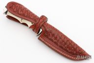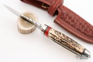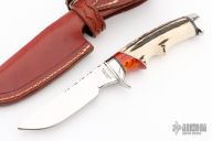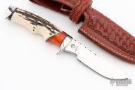 This knife by Ruffin Johnson features a mirror polish blade with fileworked spine, .180" blade stock, .910" blade depth, hidden tang construction. The handle has a mirror polished stainless steel guard and butt, stag and amber grip with black/white/aluminum spacers. Comes with a hand tooled brown leather sheath. Wolf logo onset on butt. Excellent condition.