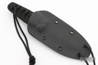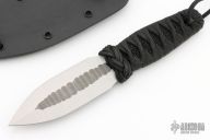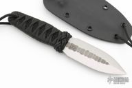 This Dagger by Josh Mason features a satin finish blade with rock carved center, .147" blade stock, 1.397" blade depth with hidden tang construction. The handle has a Turk's head knot as a guard, and a wrapped handle over stingray skin. Comes with a Kydex sheath. Excellent condition.