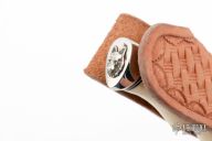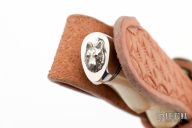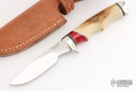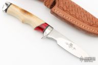 This knife by Ruffin Johnson features a hand rub satin finished blade with .140" blade stock, .823" blade depth, hidden tang construction. The handle has a stainless steel guard and butt, fossil bone and red acrylic grip with black/white/aluminum spacers. Comes with a hand tooled brown leather sheath. Wolf logo onset on butt. Excellent condition.