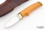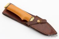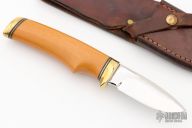 This knife by Ruffin Johnson features a mirror finished blade with .180" blade stock, 1.033" blade depth, hidden tang construction. The handle has a brass guard and butt, yellow paper micarta grip with black/brass spacers. Comes with a brown leather sheath. Has some light scratches, otherwise excellent condition.