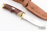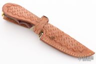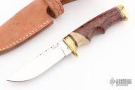 This knife by Ruffin Johnson features a mirror polish blade with fileworked spine, .170" blade stock, .913" blade depth, hidden tang construction. The handle has a brass guard and butt, oosic and dyed maple burl grip with black/white/aluminum spacers. Comes with a hand tooled brown leather sheath. Wolf logo onset on butt. Excellent condition.