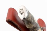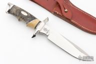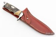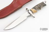 This knife by Ruffin Johnson features a mirror polish blade with false top edge, .247" blade stock, 1.170" blade depth, hidden tang construction. The handle has a stainless steel guard and butt, maple burl grip with black/white/aluminum spacers. Comes with a brown leather sheath and zippered case. Wolf logo onset on butt. Excellent condition.