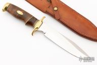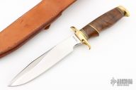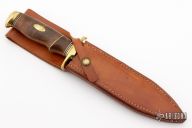 This knife by Ruffin Johnson features a mirror polish blade with false top edge, .249" blade stock, 1.330" blade depth, hidden tang construction. The handle has a brass guard and butt, walnut grip with black/white/brass spacers. Comes with a brown leather sheath. Excellent condition.