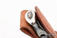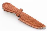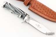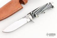 This knife by Ruffin Johnson features a mirror polish blade with fileworked spine, .178" blade stock, .941" blade depth, hidden tang construction. The handle has a stainless steel guard and butt, zebra acrylic grip with black/white/aluminum spacers. Comes with a hand tooled brown leather sheath. Wolf logo onset on butt. Excellent condition.