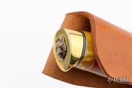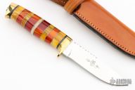 This knife by Ruffin Johnson features a mirror polish blade with fileworked spine, .174" blade stock, 1.030" blade depth, hidden tang construction. The handle has a brass guard and butt, stacked amber and oosic grip with black/white/aluminum spacers. Comes with a brown leather sheath. Wolf logo onset on butt. Excellent condition.