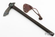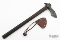This Raven Beak Spike Tomahawk by Robert Lindsey features a color case hardened head with spike pole. Has an 18.5" fire hardened hickory handle. Has leather edge sheath with wood bead tightener. New from maker at the 2023 Blade Show. He's been making these a long time and they are fantastic!