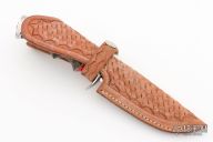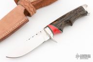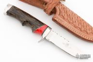 This knife by Ruffin Johnson features a mirror polish blade with fileworked spine, .176" blade stock, .916" blade depth, hidden tang construction. The handle has a stainless steel guard and butt, black palm wood grip with black/white/aluminum spacers. Comes with a hand tooled brown leather sheath. Wolf logo onset on butt. Excellent condition.
