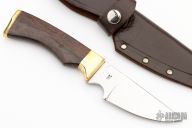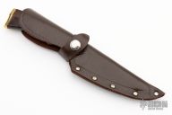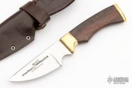 This Deer Slayer by Precise Knives features a mirror polished blade with notched thumbrest, .112" blade stock and 1.363" blade depth, hidden tang construction. The handle has a brass guard and butt, rosewood grip. Coems with a brown leather sheath. Has a few light scratches, otherwise excellent condition.