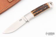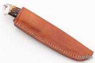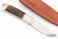 This integral Drop Point Hunter from Dietmar Kressler features a drop point hand rubbed satin finish blade with a checkered thumbrest, .166" blade stock and .962" blade depth. The handle has integral fluted bolsters and beautiful stag scales with red liners and a full tapered tang. Comes with a brown leather sheath with belt loop and zippered case. Excellent condition. A beautiful piece.