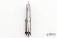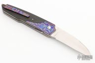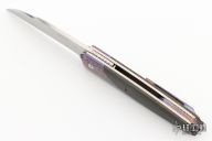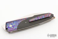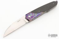 This Front Flipper by Stephane Sagric features a hand rub satin finish wharncliffe blade with swedge and notched thumbrest, front flipper style opening. The handle has DarkTi bolsters, carbon fiber scales with titanium liners, matching backbar and tip up clip. Rides on bearings, nice detent, lockup and blade seating. Comes with leather case, patch, sticker, and coin. New from Maker!