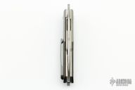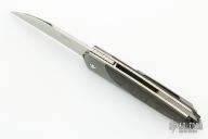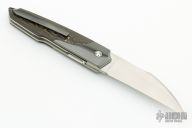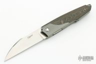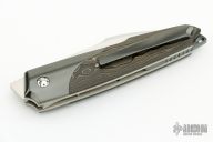 This Front Flipper by Stephane Sagric features a hand rub satin finish wharncliffe blade with swedge and notched thumbrest, front flipper style opening. The handle has Zirconium bolsters, carbon fiber scales with titanium liners, matching backbar and tip up clip. Rides on bearings, nice detent, lockup and blade seating. Comes with leather case, patch, and coin. New from Maker!