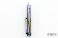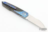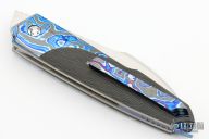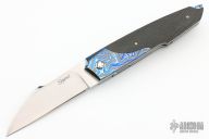 This Front Flipper by Stephane Sagric features a hand rub satin finish wharncliffe blade with swedge and notched thumbrest, front flipper style opening. The handle has DarkTi bolsters, carbon fiber scales with titanium liners, matching backbar and tip up clip. Rides on bearings, nice detent, lockup and blade seating. Comes with leather case, patch, and coin. New from Maker!